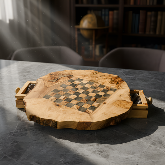 Échiquier en bois d'olivier avec pièces d'échecs - Différentes tailles disponibles