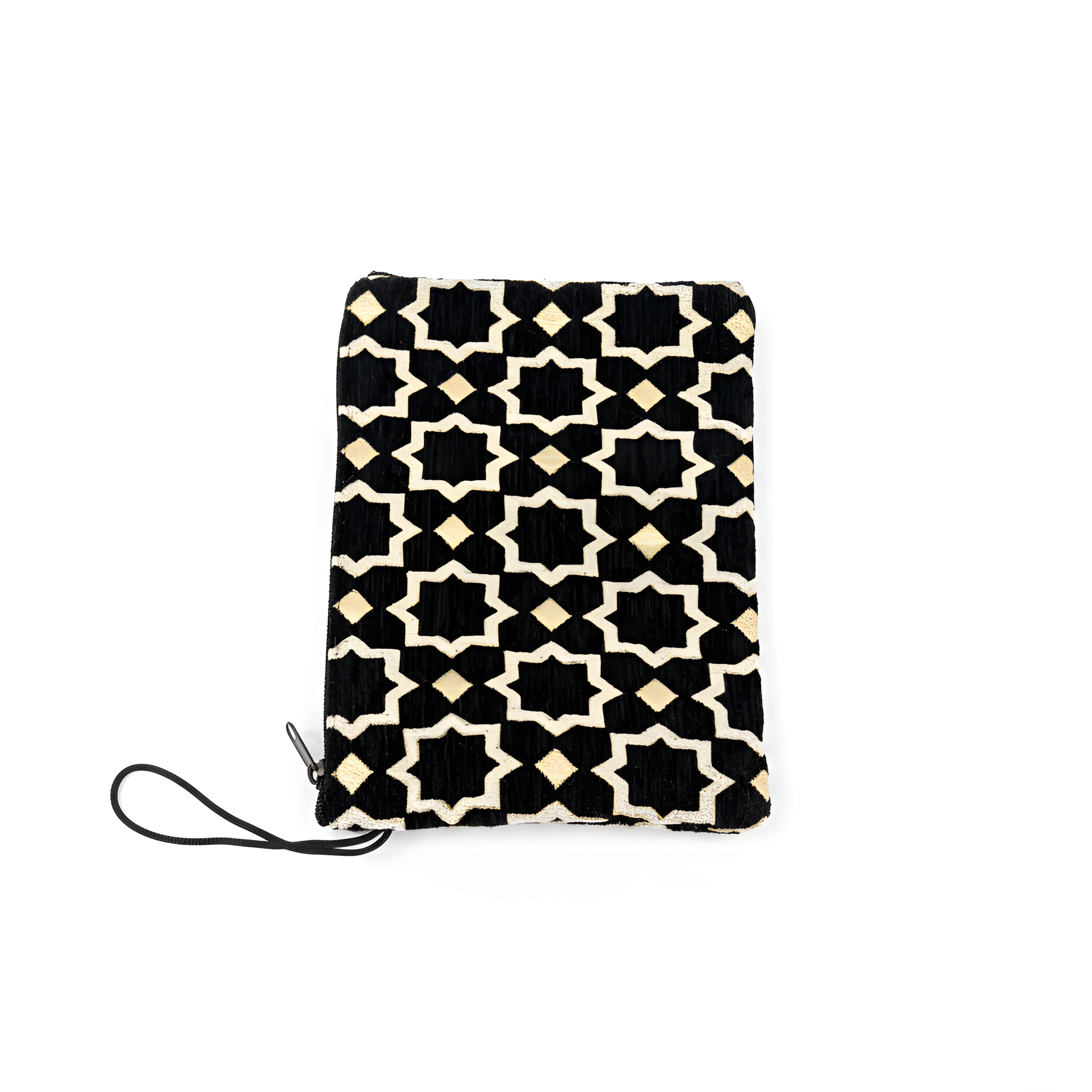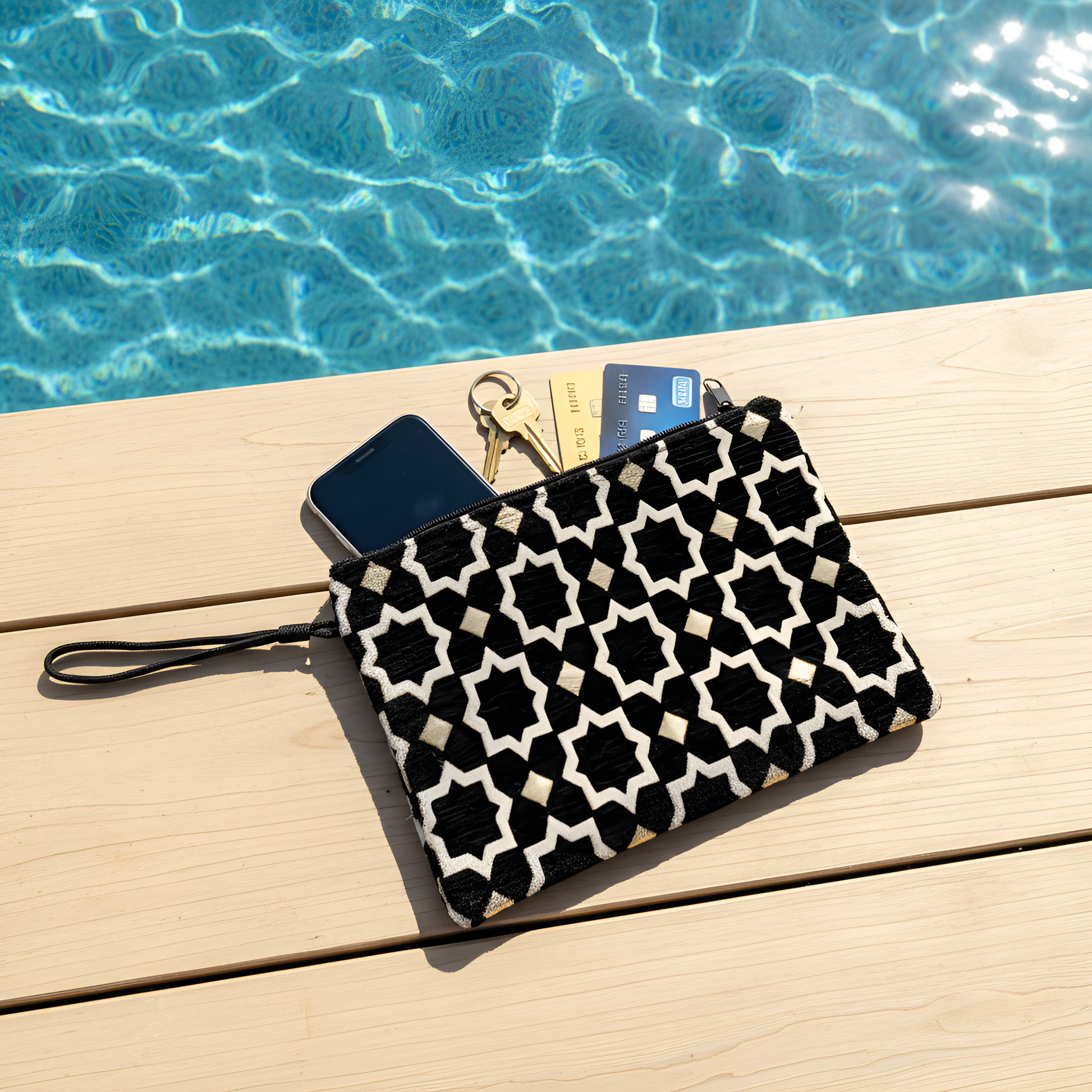 La pochette Laurence – Noir est l'accessoire chic par excellence. Son tissu noir orné de motifs géométriques blancs et dorés apporte une touche élégante et moderne, idéale aussi bien pour le quotidien que pour une soirée.