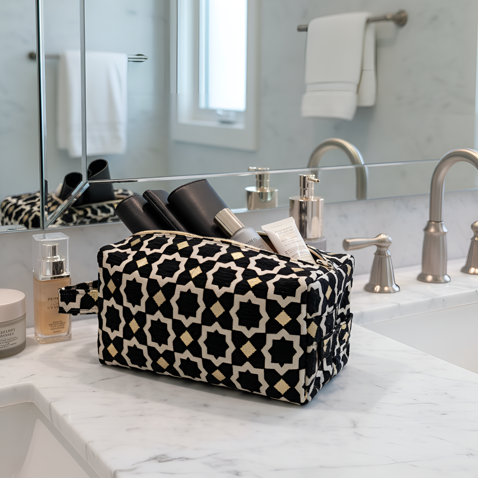 Trousse de toilette Laurence – Noir – Motifs géométriquesavec motifs géométriques blancs et dorés